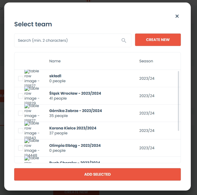 Wybierz drużynę z listy lub wyszukaj drużynę po nazwie.
