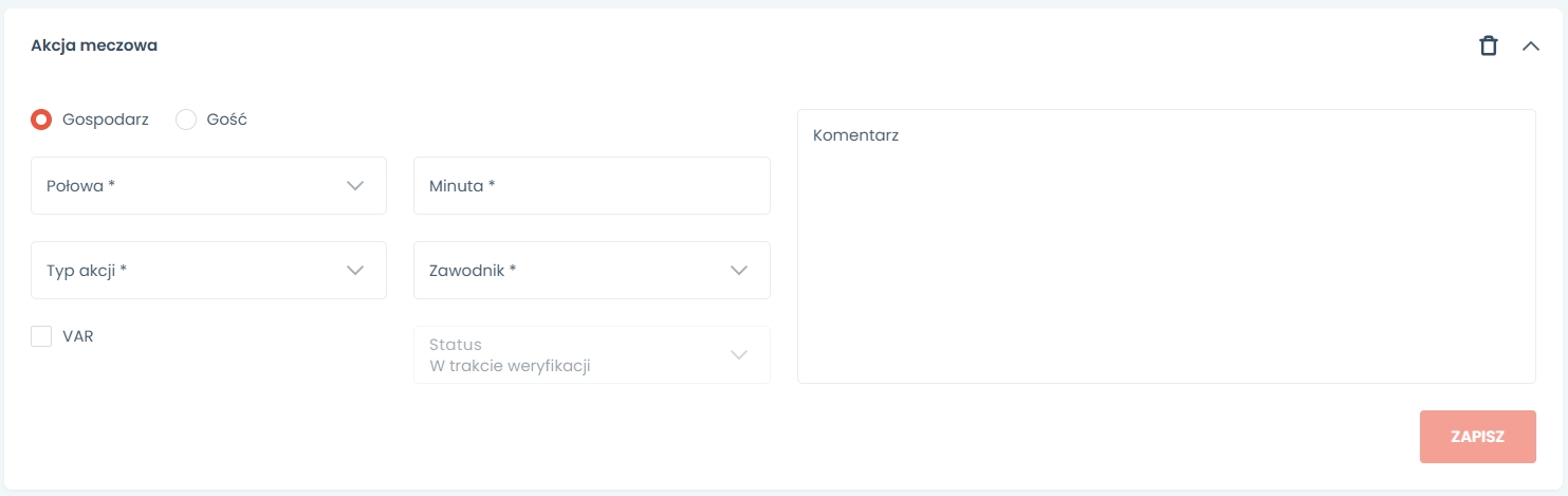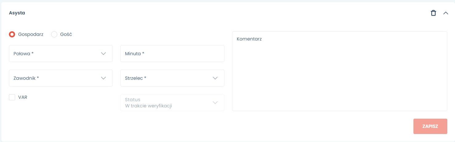 Wybierz, czy asysta była po stronie gospodarzy czy gości.