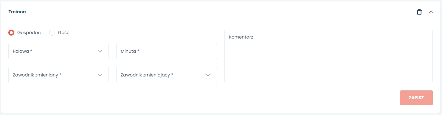 Wybierz nazwiska wchodzącego i schodzącego zawodnika z listy rozwijanej.
