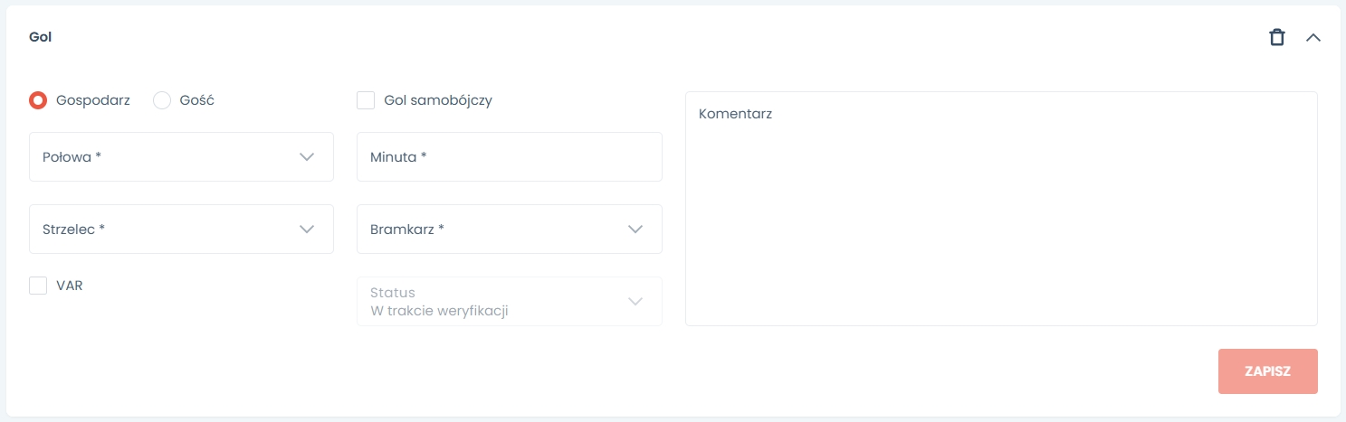 Podaj status gola, czy jest zweryfikowany, czy oczekuje na weryfikację.