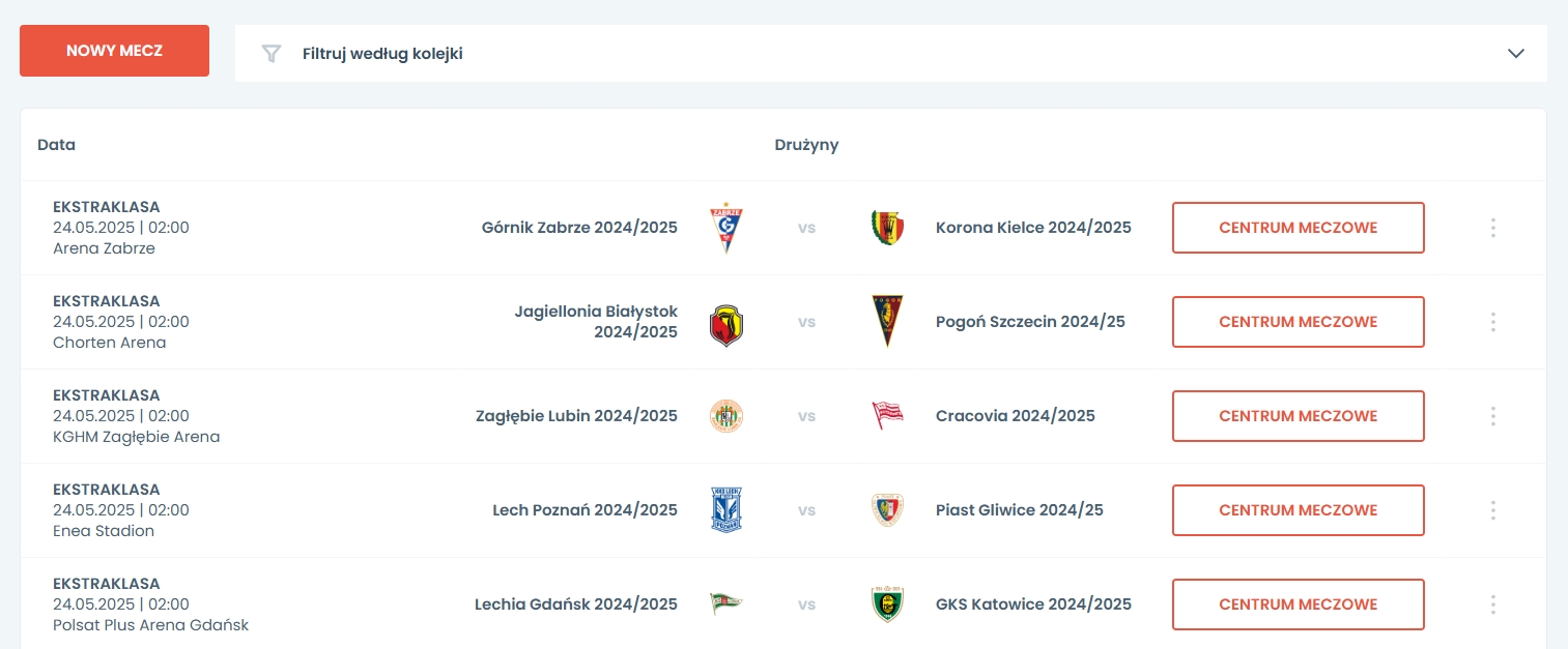 Aby otworzyć formularz już utworzonego Meczu, kliknij nazwę Meczu, który chcesz edytować, wymieniony w tabeli.