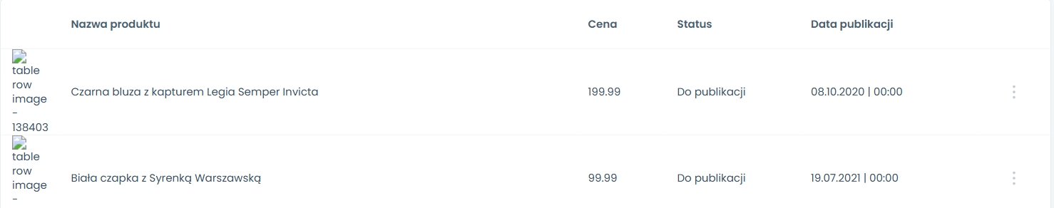 Produkty są wyświetlane w wierszach tabeli. Każdy wiersz ma opcję.