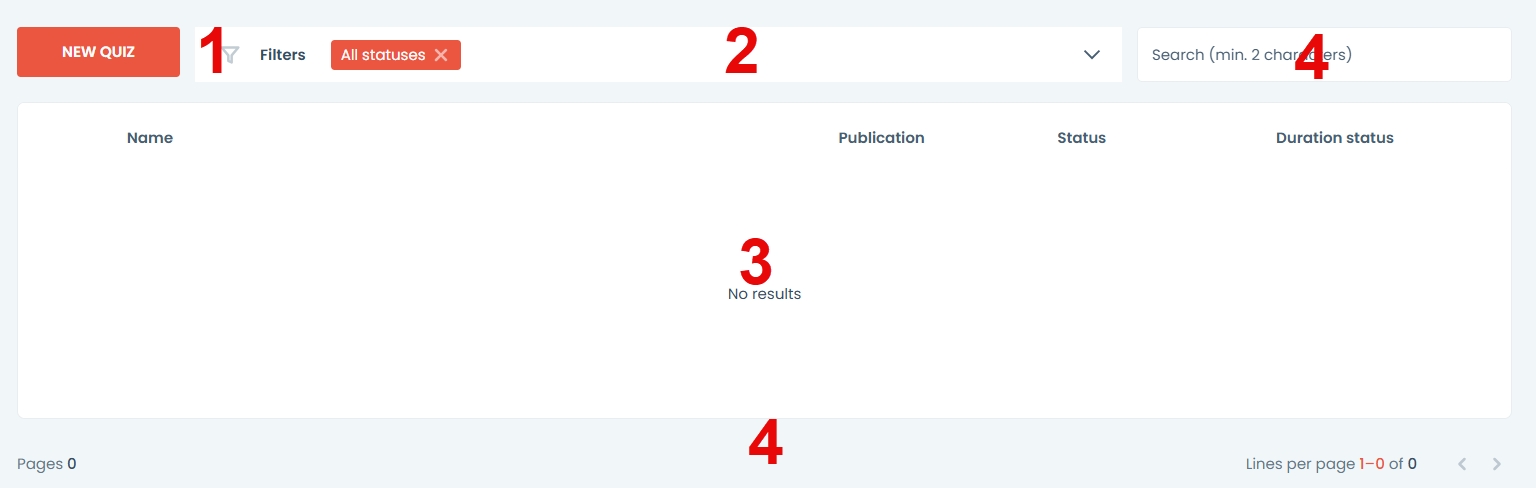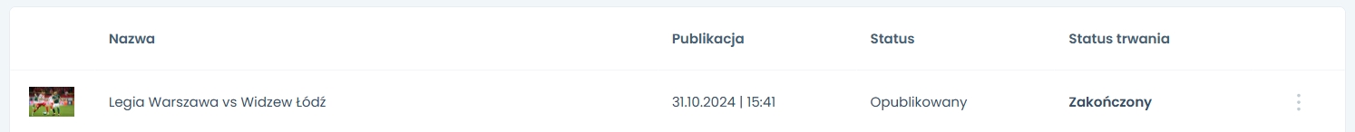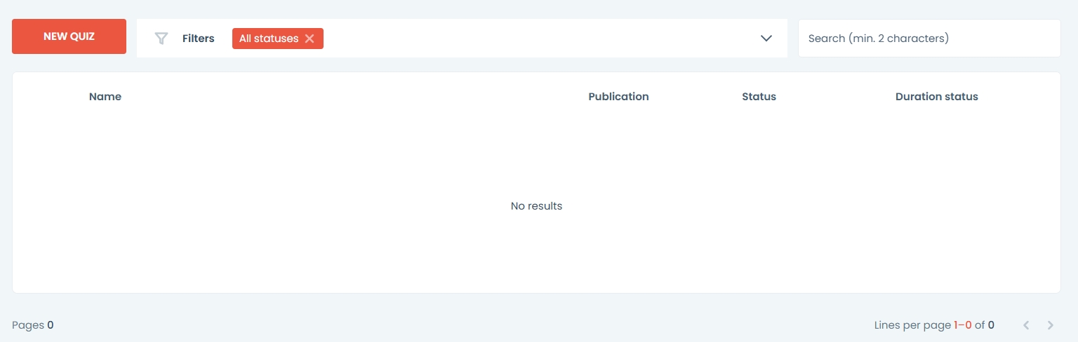 Quizy są wyświetlane w wierszach tabeli. Każdy wiersz ma opcję.